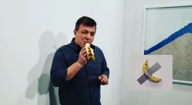 法新社報導,這項驚世駭俗的行動發生在美國邁阿密海灘(Miami Beach)的巴塞爾藝術展(Art Basel),一名行為藝術家在眾目睽睽下對義大利藝術家卡特蘭(Maurizio Cattelan)的作品「喜劇演員」(Comedian)下手。而這幅作品已以12萬美元賣給法國收藏家。