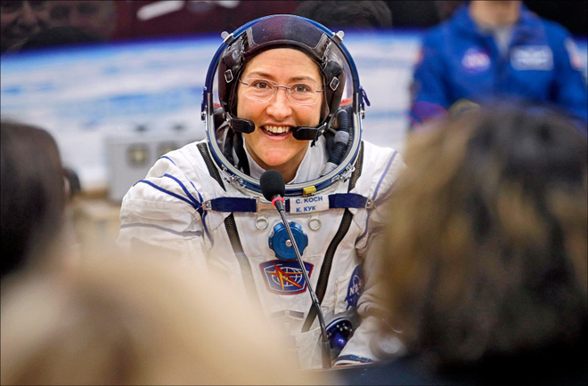 美國國家航太總署(NASA)的女太空人科克(Christina Koch,右圖)自今年三月十四日抵達國際太空站(ISS)起,截至本月廿九日,已在太空中待了長達兩百九十天,打破前輩女太空人惠特森(Peggy Whitson)二○一七年寫下的二百八十八天紀錄,成為單次任務中在太空停留最久的女性。