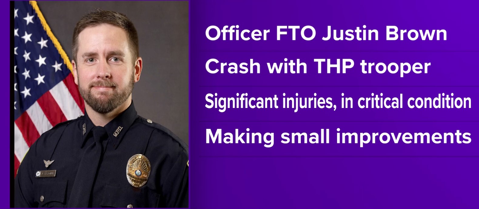 Brown 已於週六接受手術,目前仍在重症監護病房,傷勢嚴重但有小幅進展。警局長表示康復過程將漫長,但感謝社區、各級執法人員與民眾的祈禱與支持。