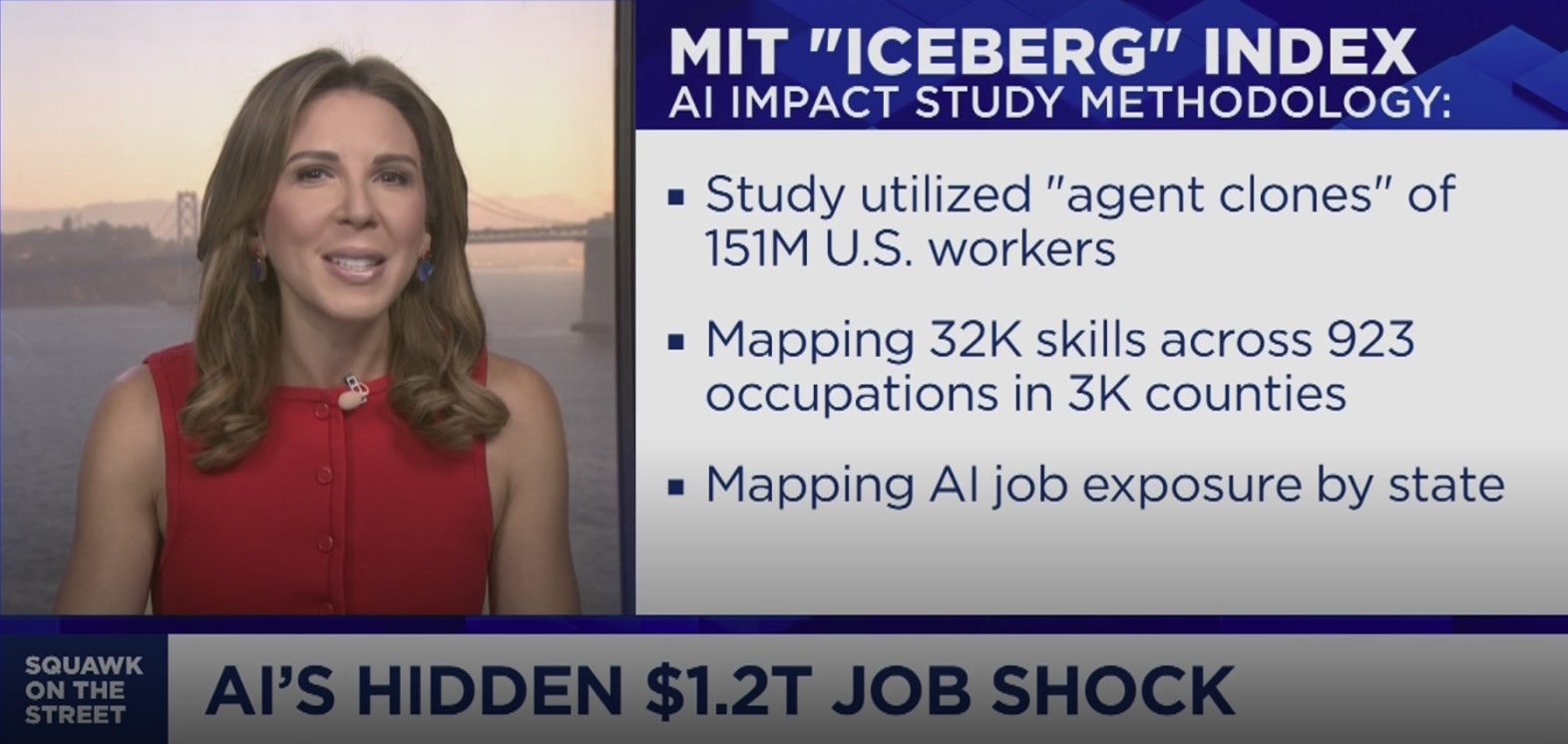該研究使用 MIT 和橡樹嶺國家實驗室開發的「冰山指數」(Iceberg Index) 勞動力模擬工具,模擬全美 1.51 億勞工如何受 AI 和相關政策影響。今年稍早公布的冰山指數,不只看沿海科技重鎮,而是涵蓋全美每個州,顯示 AI 如何改變勞動市場。