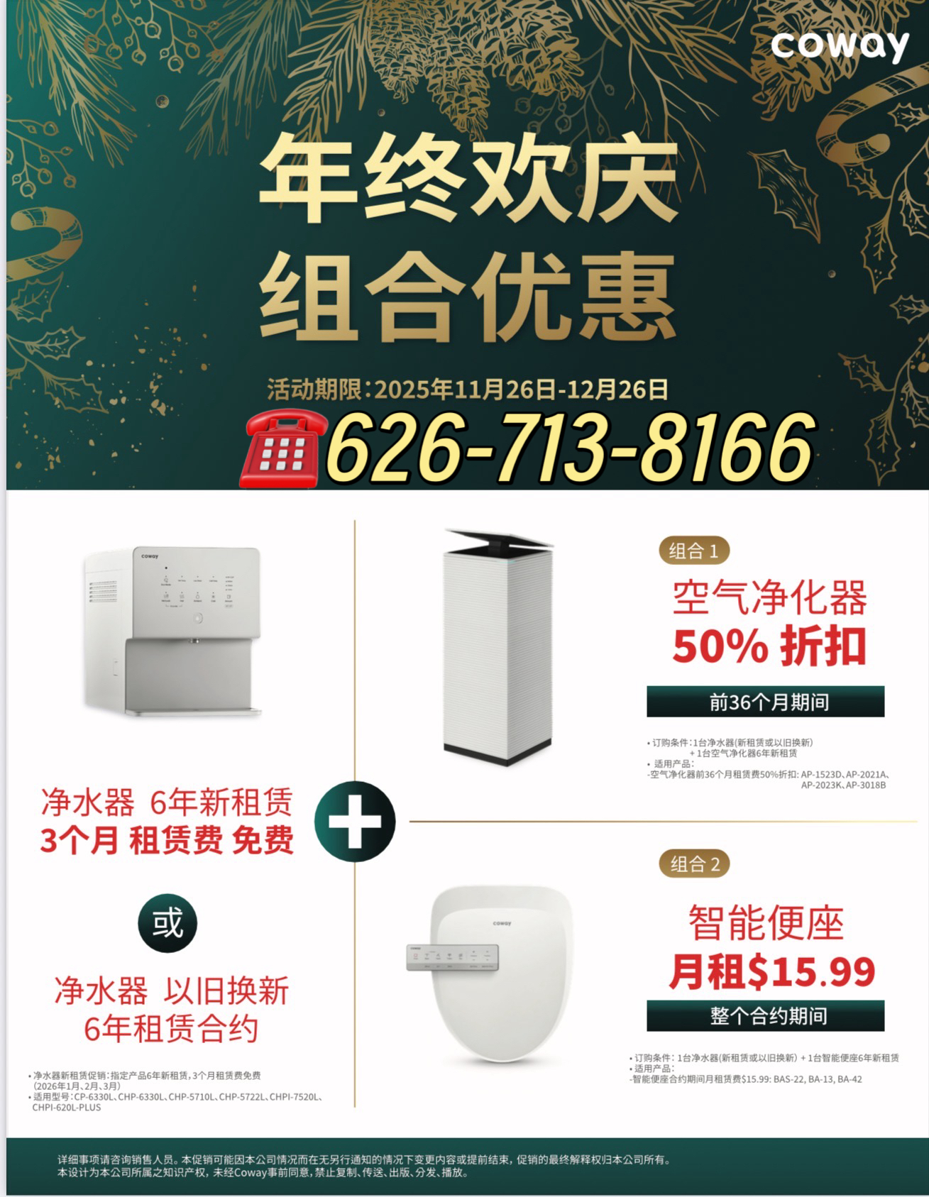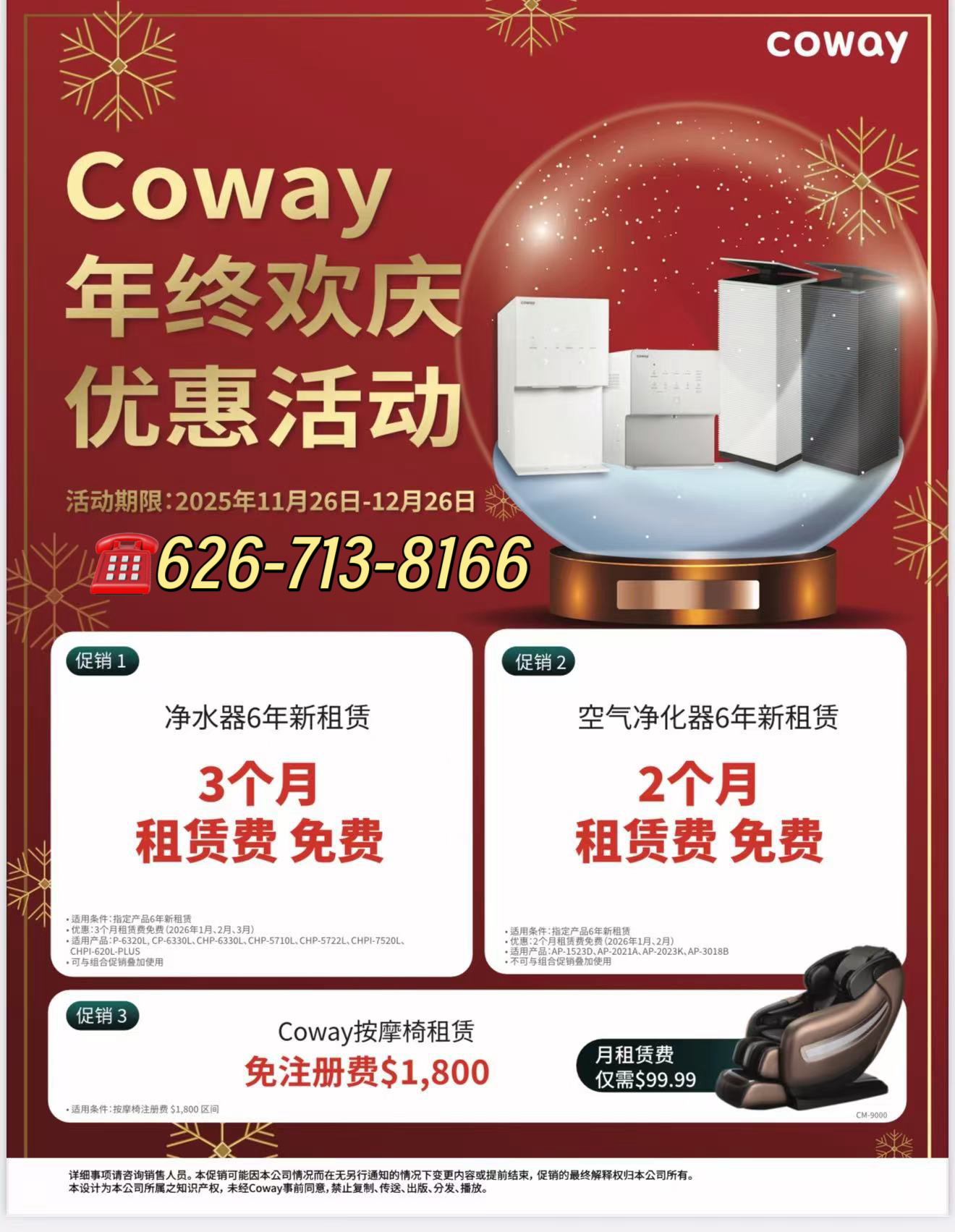 多款健康家电租赁方案同步上线** 【美国讯】国际健康家电品牌 Coway 近日在美国市场正式推出 年终欢庆优惠活动。本次活动面向家庭用户,涵盖净水器、空气净化器、智能便座及按摩椅等多类产品,通过多种租赁减免与组合优惠方案,为消费者提供年终健康家电升级选择。 据悉,本次活动时间为 2025年11月26日至12月26日。活动期间,消费者选择 Coway 指定 净水器 6 年全新租赁方案