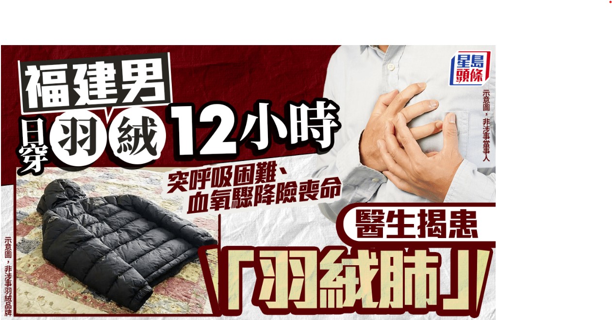 根據陸媒《紅星新聞》報導,福建一名男子連續4個星期、每日穿著羽絨衣超過12小時,而他身上的羽絨衣是從網路購買的低價商品,內襯已有破損,只要稍微活動,羽絨纖維便不斷從縫線處飄散。近日男子突然感到呼吸困難,就醫檢查才知道血氧飽和度剩85%,甚至早就發生呼吸衰竭,被確診為過敏性肺炎。