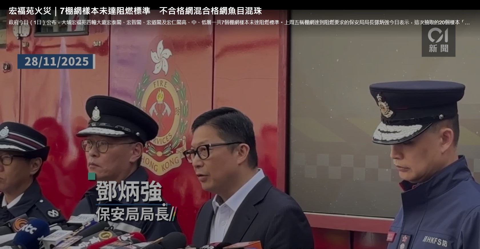 綜合法新社和路透社報導,鄧炳強召開記者會說明大火處理情況,他還向受災民眾表達慰問。