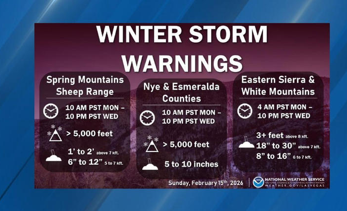 與此同時,山區的「冬季風暴警報」(Winter Storm Warning)將持續有效至週三晚間 10 點。預計 Lee Canyon 將有 14 至 20 英吋的降雪,Kyle 地區則有 12 至 18 英吋。特別值得關注的是 Mountain Springs 地區,預計降雪量為 4 至 7 英吋,這將對早晨往返當地的通勤者構成嚴重威脅,氣象局提醒民眾出發前務必確認道路管制狀況。
