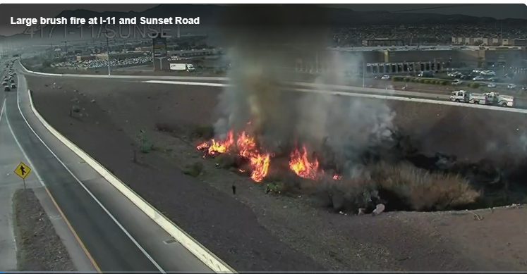 記者晨楓報導,週二早晨,內華達州亨德森地區(Henderson)爆發了一場規模巨大的灌木叢火災,導致 11 號州際公路(I-11)與日落路(Sunset Road)交匯處附近的交通陷入癱瘓。根據內華達州公路巡邏隊(NHP)的消息,巡邏員在清晨約 6 時 49 分接到求助請求,協助亨德森消防局進行滅火與交通管制。這場突如其來的大火釋放出大量濃煙,嚴重影響了駕駛視線,消防官員隨即封鎖了 I-11 南行方向通往日落路的上坡匝道,以確保公共安全並利於救災車輛進入。